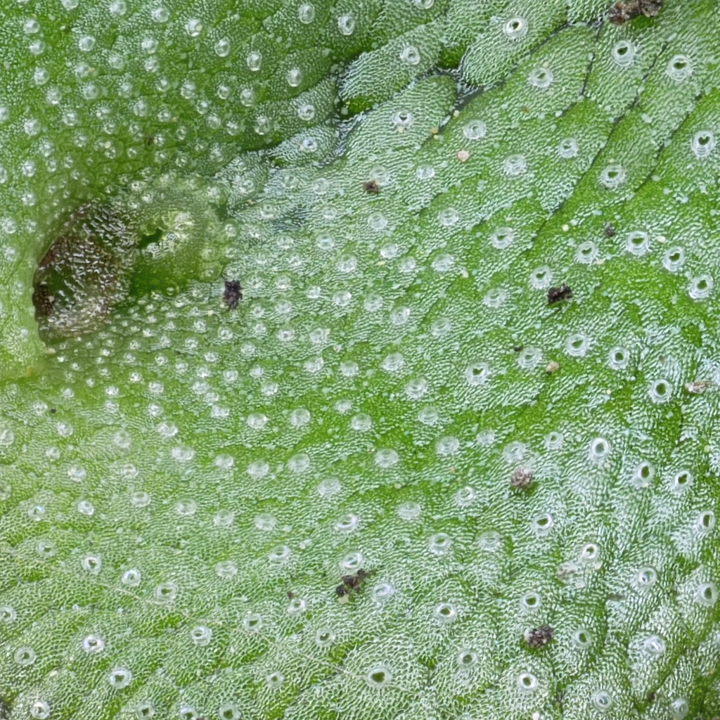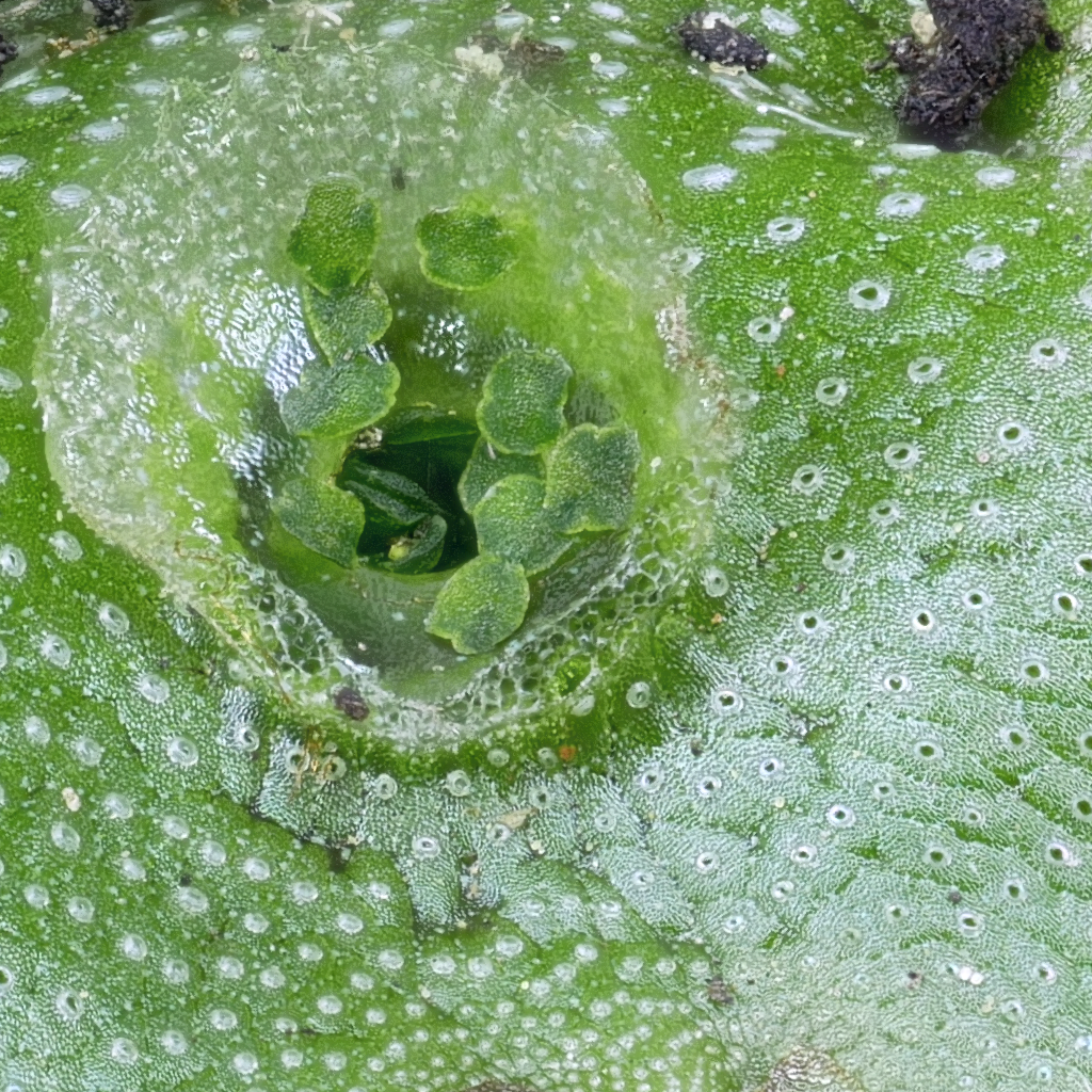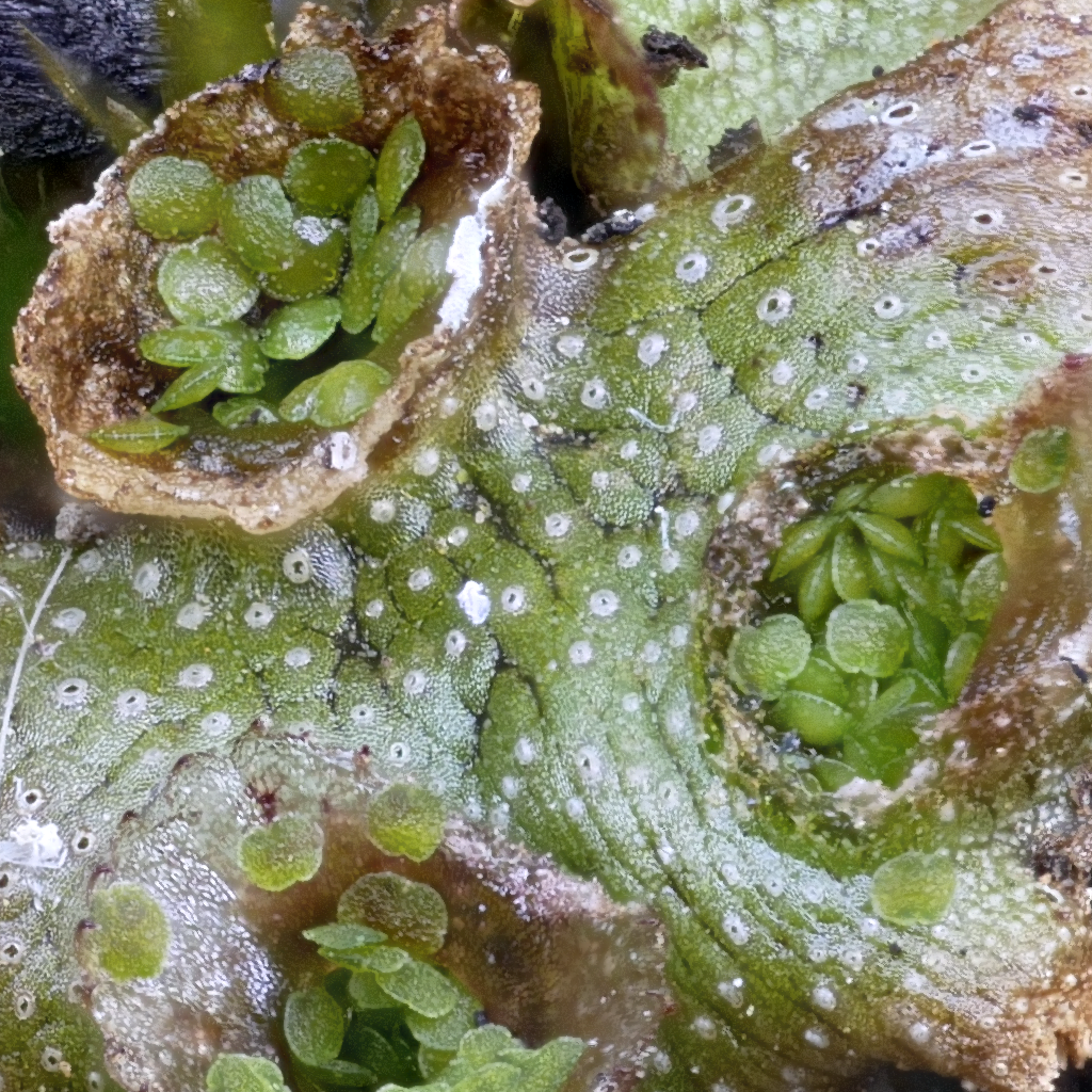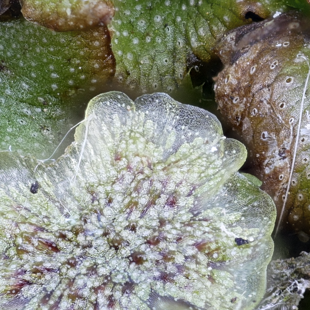 Some real-world examples are shown below - with our favourite subject, Marchantia polymorpha. For these images, the camera was propped next to the plant, either braced against the ground, or supported on a mini-tripod. Image stabilisation was used in camera, and the focus-stacking software provides image registration for small movements between frames.