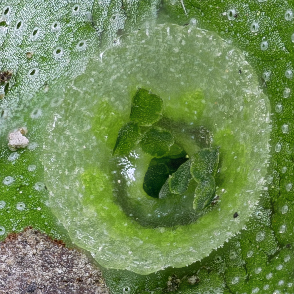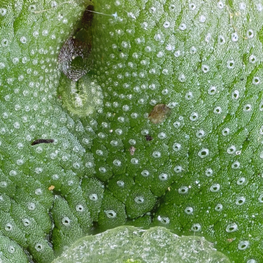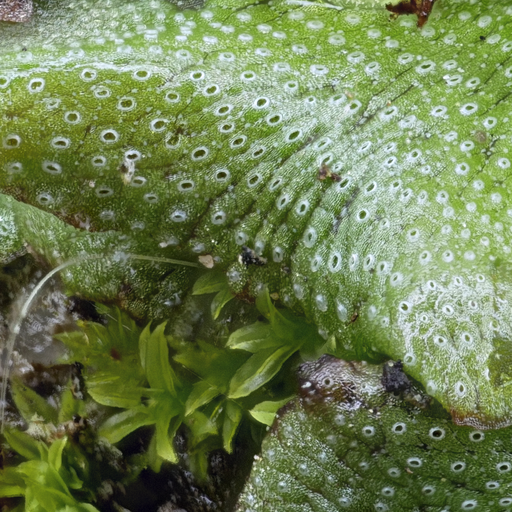 Some real-world examples are shown below - with our favourite subject, Marchantia polymorpha. For these images, the camera was propped next to the plant, either braced against the ground, or supported on a mini-tripod. Image stabilisation was used in camera, and the focus-stacking software provides image registration for small movements between frames.