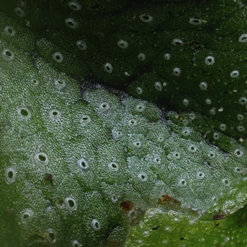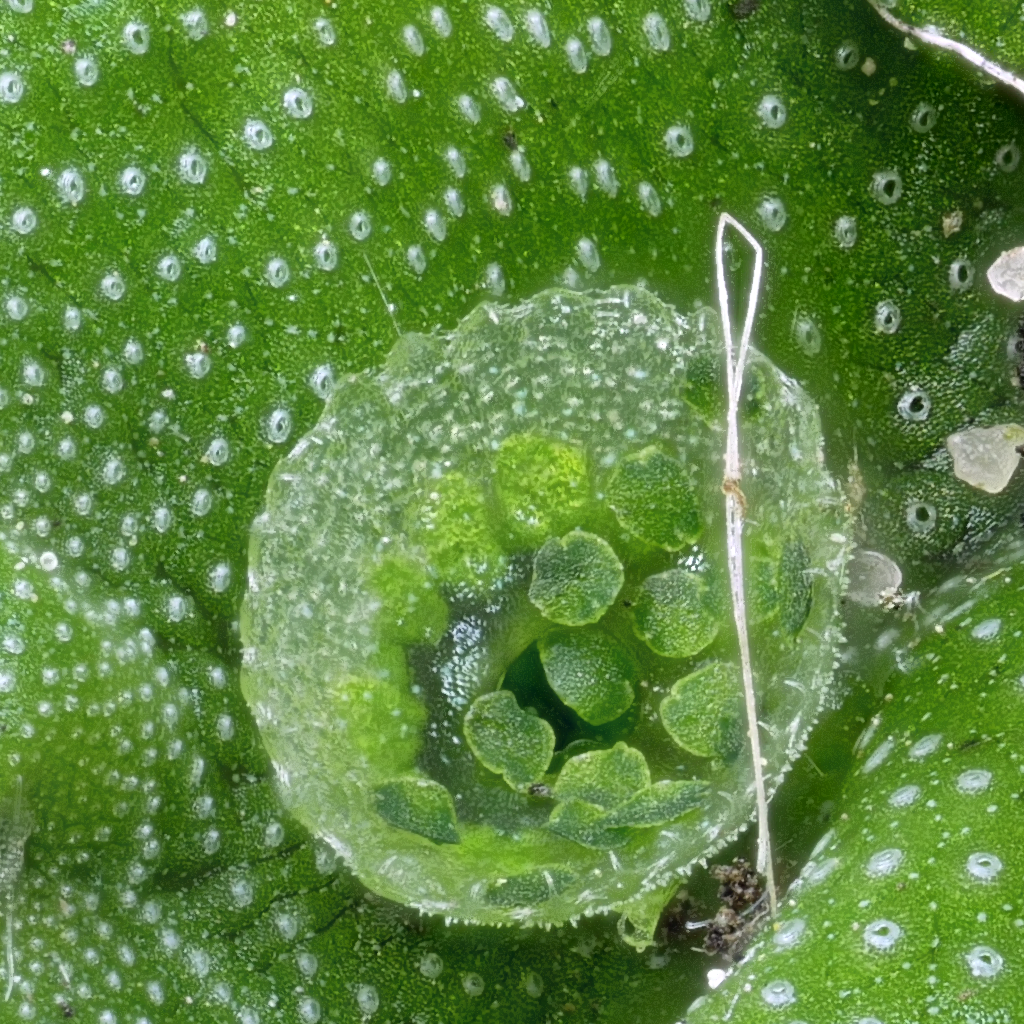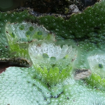 Some real-world examples are shown below - with our favourite subject, Marchantia polymorpha. For these images, the camera was propped next to the plant, either braced against the ground, or supported on a mini-tripod. Image stabilisation was used in camera, and the focus-stacking software provides image registration for small movements between frames.